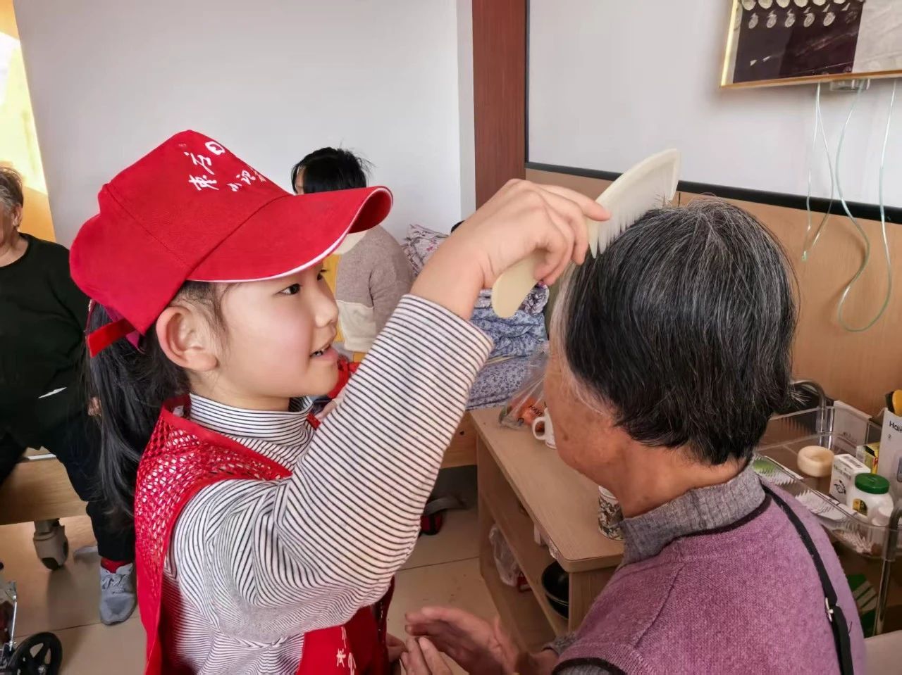 節(jié)目結(jié)束后,小記者們又主動(dòng)為老人們梳頭。他們動(dòng)作輕柔,小心翼翼地梳理著老人的頭發(fā),眼神中滿是關(guān)切。老人們的臉上露出了幸福又滿足的笑容。